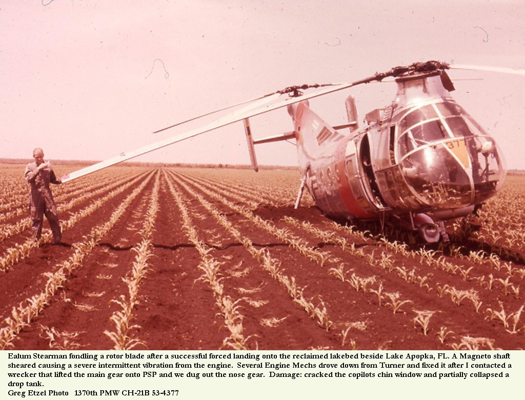 The left main landing gear struck a tree stump during the turn, causing the H-21 to roll over on its left side. The crew deplaned without injury, as the engine section burst into flames. The pilot suffered a badly sprained ankle as he evacuated the area. No other injuries were sustained by ground or aircrew personnel. The aircraft was destroyed by post impact fire. The accident investigation board determined the primary cause of the accident to be unsatisfactory landing pad conditions.